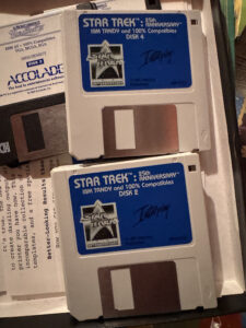 Found an old photo of my Star Trek 25th Anniversary PC game. A stack of 3.5″ floppies and that perfect line, “For IBM Tandy and 100% Compatibles.” It made me smile. Proof that this love has been here a long time.