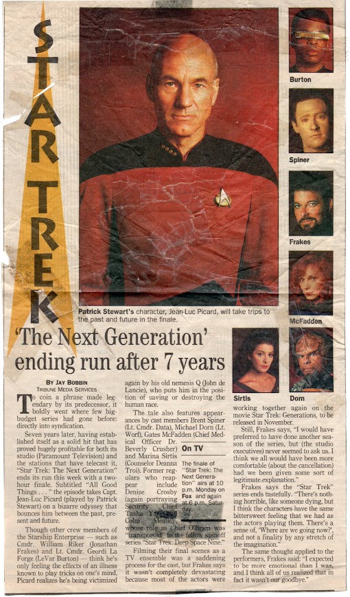 When TNG ended in 1994, it was an event for me. The first show I followed that actually concluded while I was watching. I saw the finales of Cheers, Seinfeld, and MAS*H in syndication, but none of those hit like All Good Things… I cut out a newspaper article about the finale and kept it. Somehow I still have that clipping thirty years later. I do not have any of my Ninja Turtles, He-Man, or Transformers. The toys are gone. The newspaper is still here.